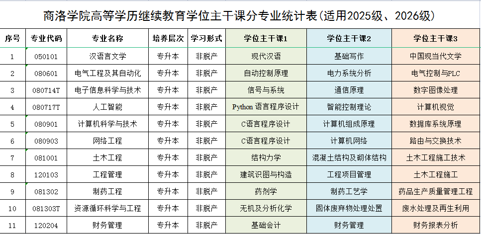 365英国上市公司官网高等学历继续教育学位主干课分专业统计表(适用2025级、2026级)