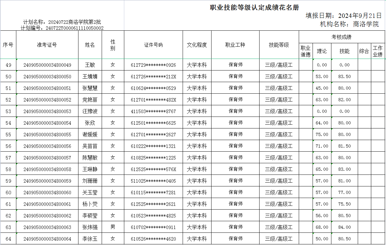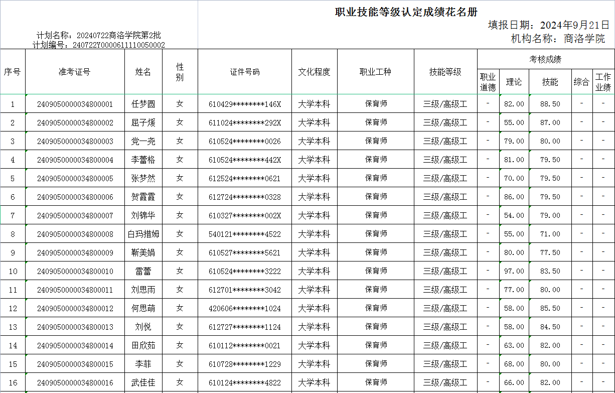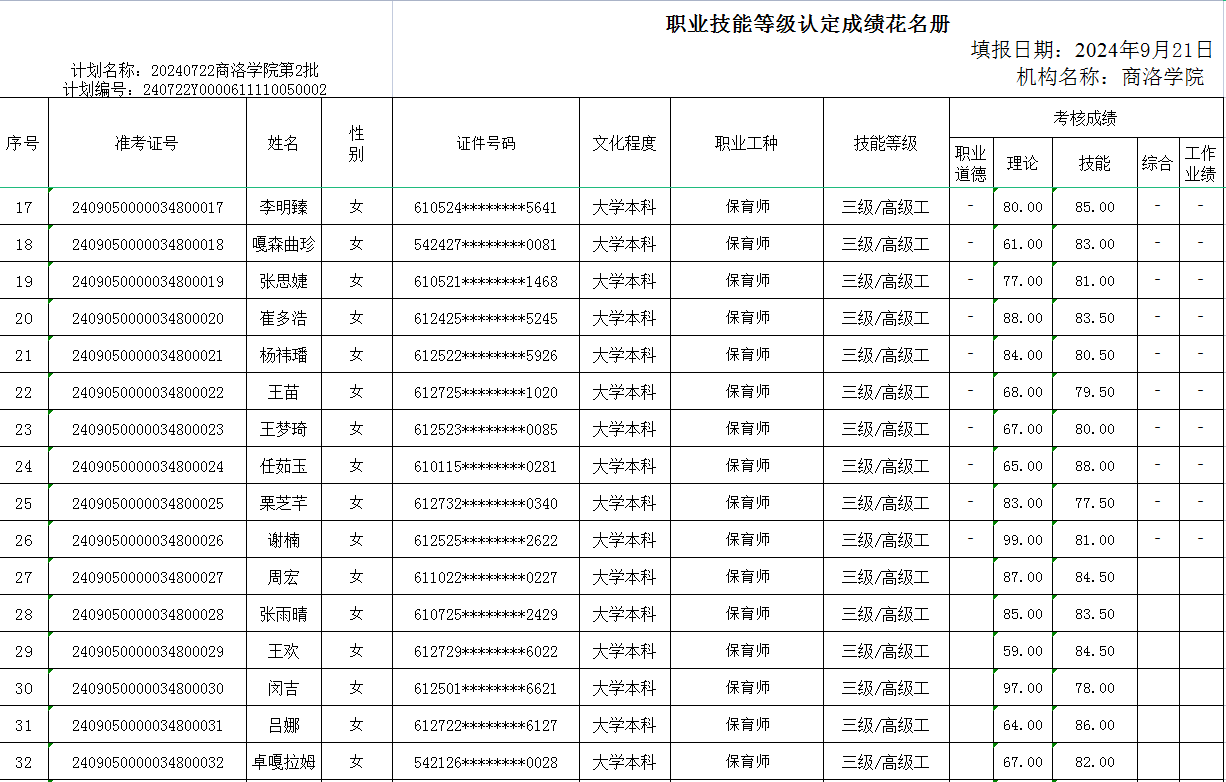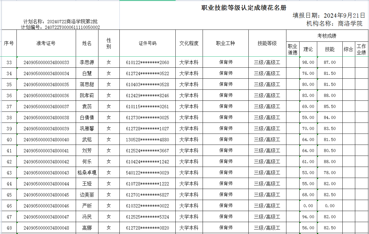 根据《365英国上市公司官网职业技能等级认定管理办法(试行)》相关规定,现将2024年9月21日保育师三级职业技能等级认定评价成绩在365上市集团官网网站进行公示。如有疑义,请与365英国上市公司官网继续教育培训中心联系。