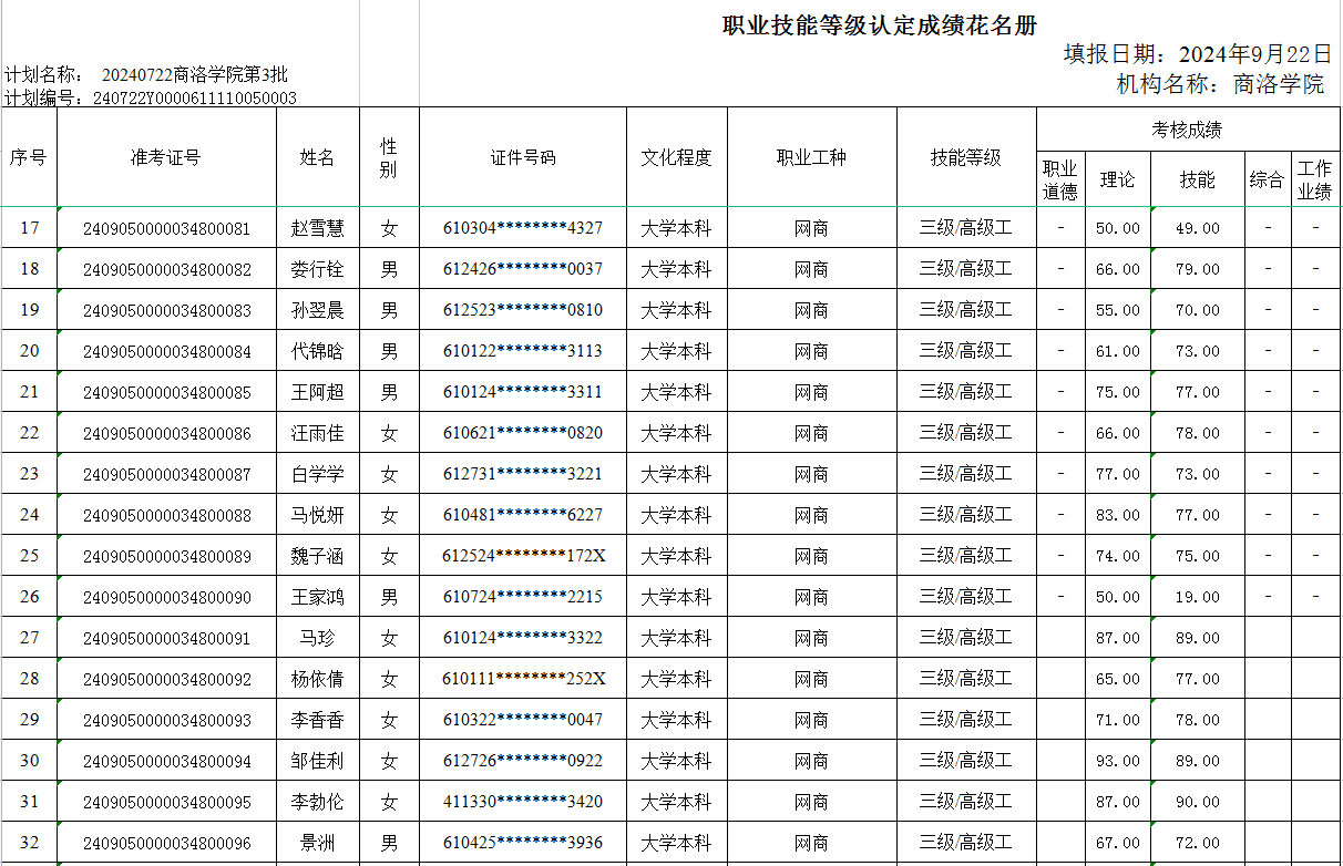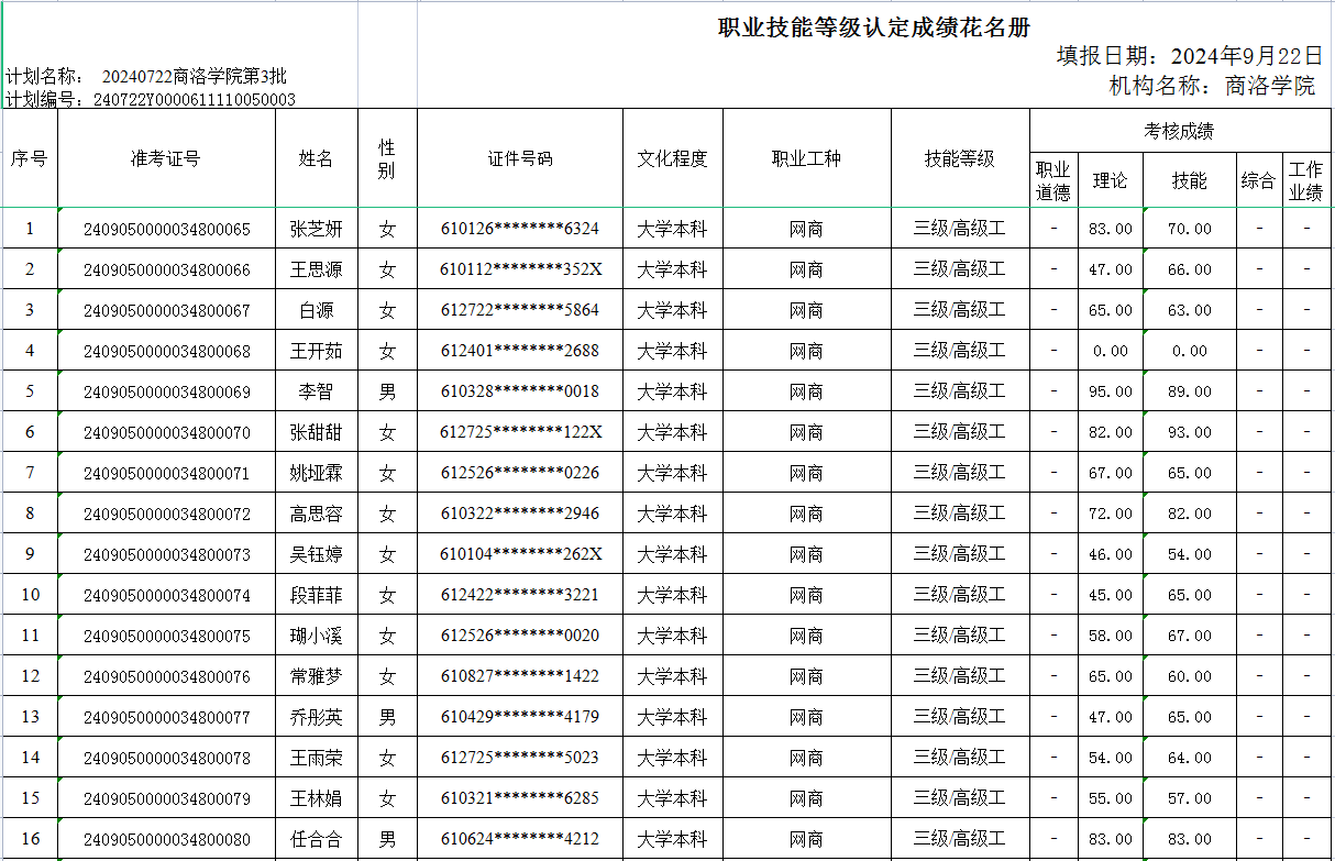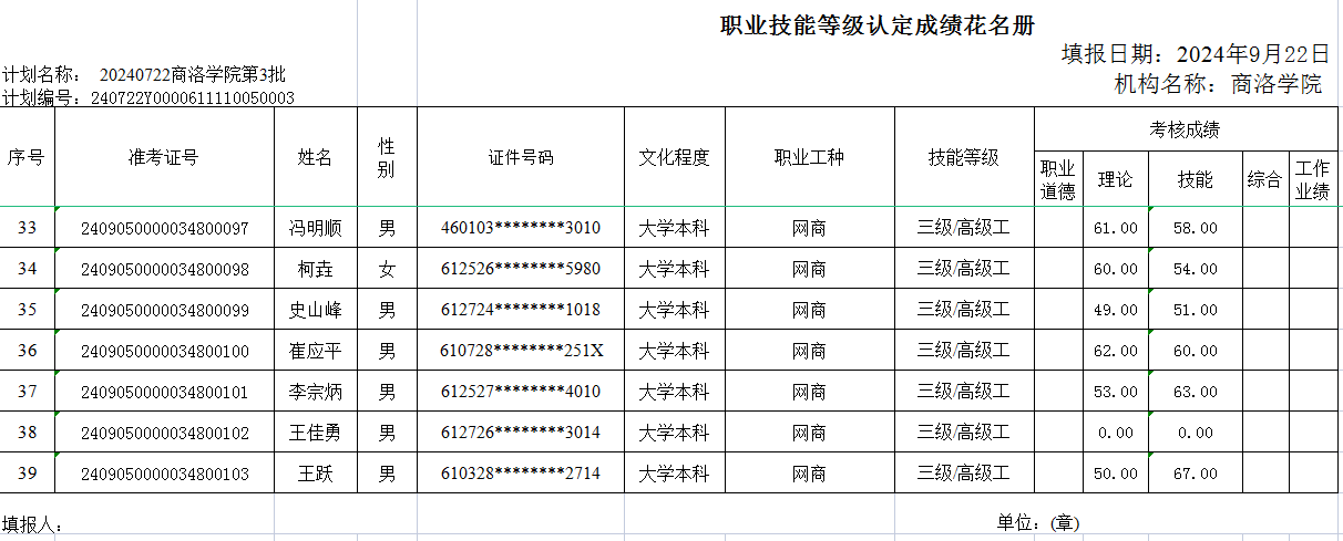 职业技能等级认定成绩公示