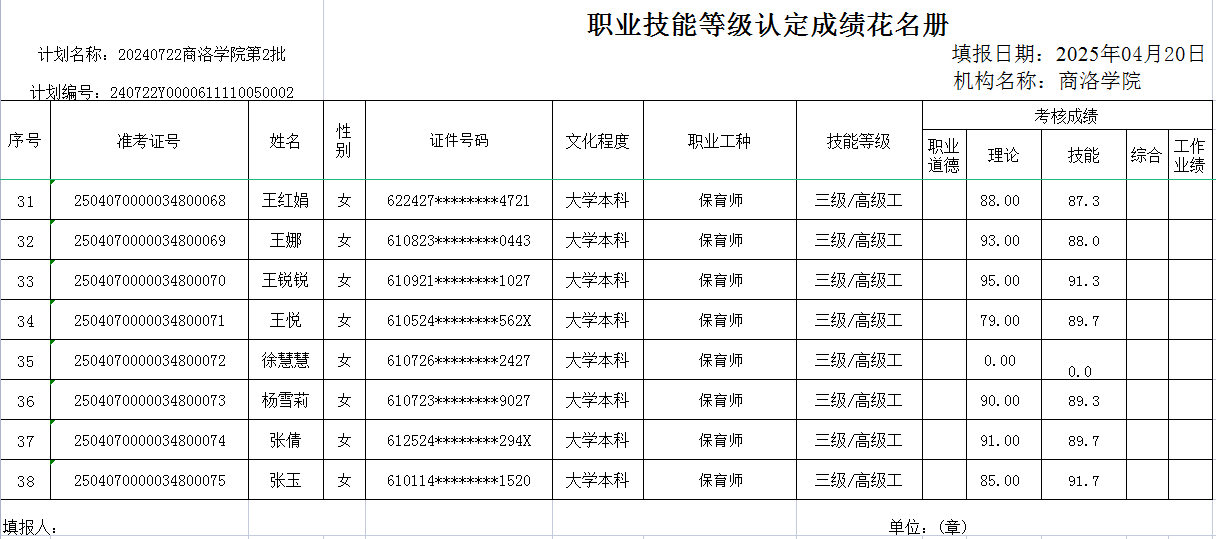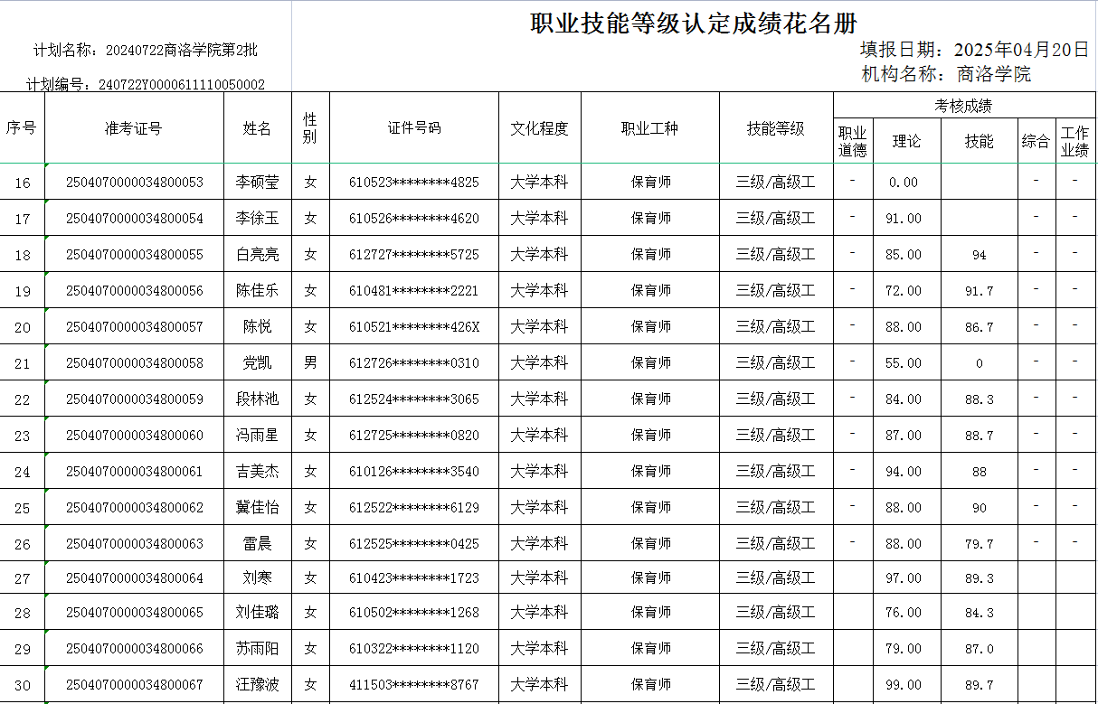 根据《365英国上市公司官网职业技能等级认定管理办法(试行)》相关规定,现将2025年4月20日保育师三级职业技能等级认定评价成绩在365上市集团官网网站进行公示。如有疑义,请与365英国上市公司官网继续教育培训中心联系。